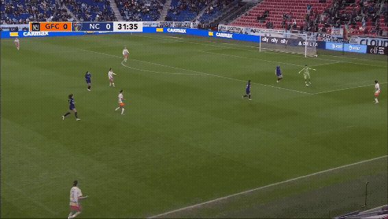 Gotham did not start with a single natural wide attacker in this game, and only one of their attackers was just as much a creator as she is a finisher. That, coupled with the fact that North Carolina’s 5-back would have the numbers advantage when Gotham went forward, meant that this offense was always going to look wacky. But despite the big Jaedyn Shaw-sized hole in Gotham’s lineup, the Bats came out of the gate swinging, generating one-third of their total xG in the first 19 minutes of the game and not allowing their opponents to take a shot until the 32nd minute.