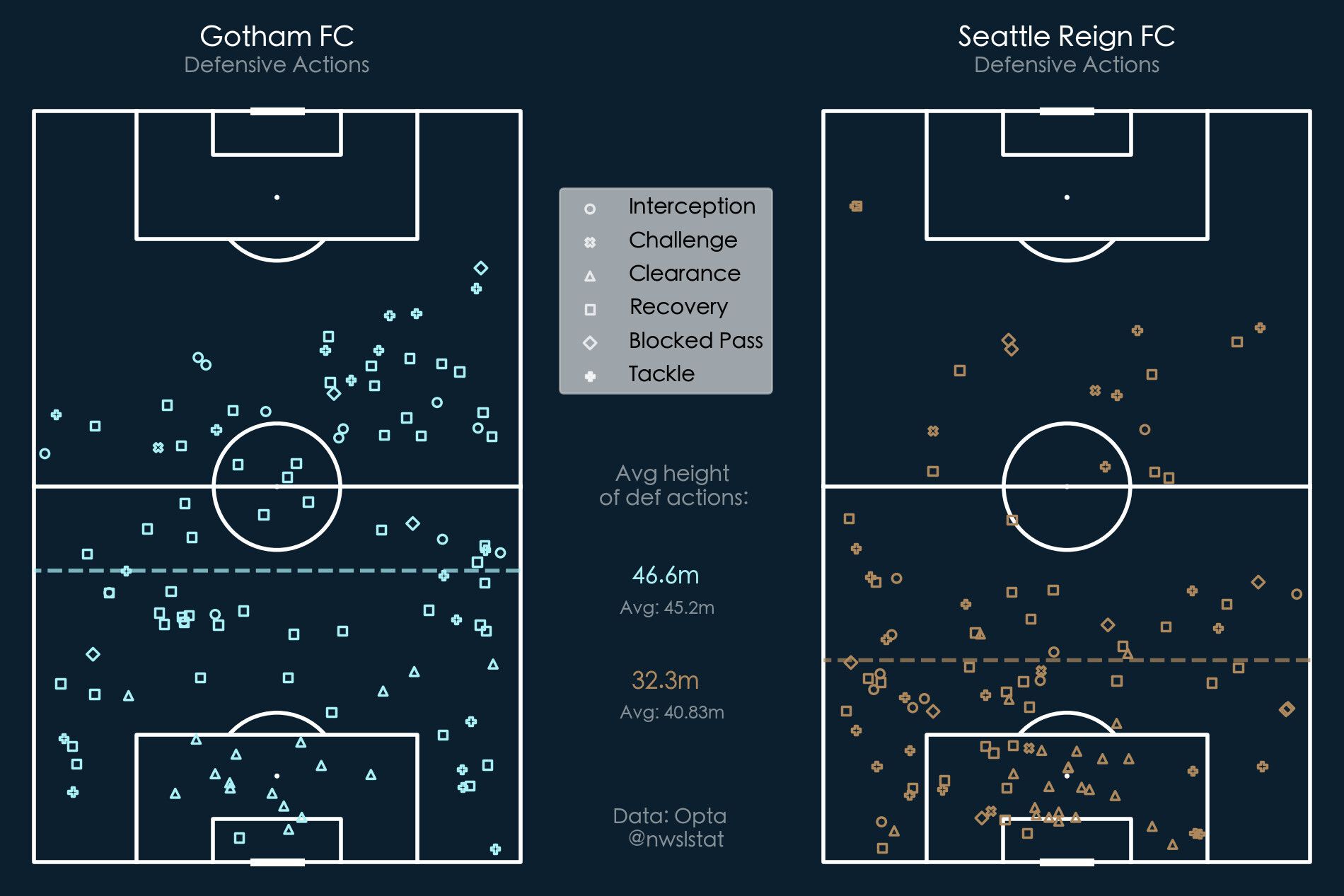The Seattle Reign played this match with a complete disinterest in scoring—if it hadn’t been for a blocked shot in the 92nd minute of the match, they would’ve been the first NWSL team since 2016 to not register a single shot in a game. Gotham, on the other hand, was very interested in scoring. The Bats put up a total of 1.18 xG from 10 shots, forcing Seattle goalkeeper Claudia Dickey into 5 saves, and had a field tilt of 76% to 24%, meaning of all the touches in either attacking third this match, 76% of them were by a Gotham player. The Bats focused on winning the ball high up the pitch, instigating defensive actions in much more advanced places than the Seattle Reign.